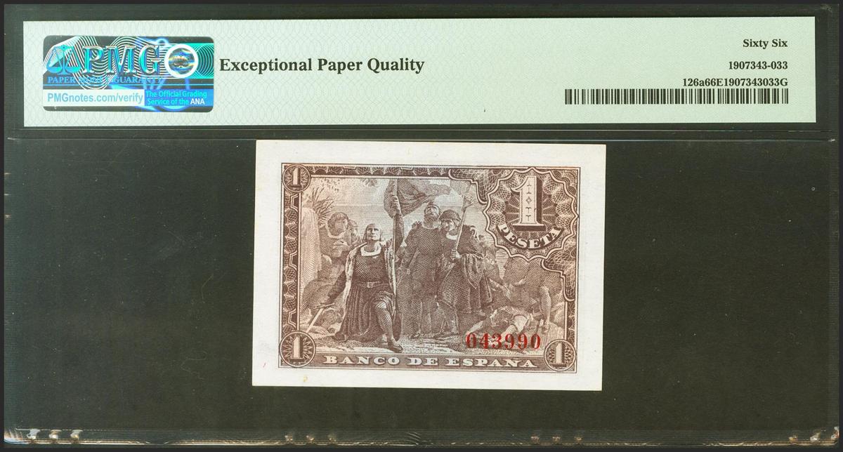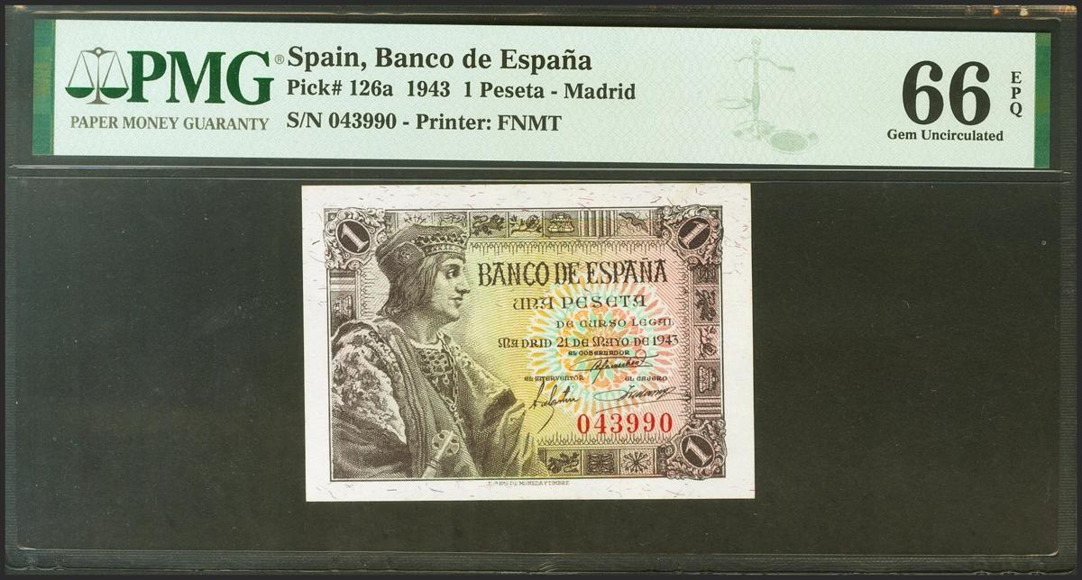 English 1 Peseta. May 21, 1943. No series. (Edifil 2021: 447, Pick: 126a). Rare in this quality, original sizing. Uncirculated. PMG66EPQ package.