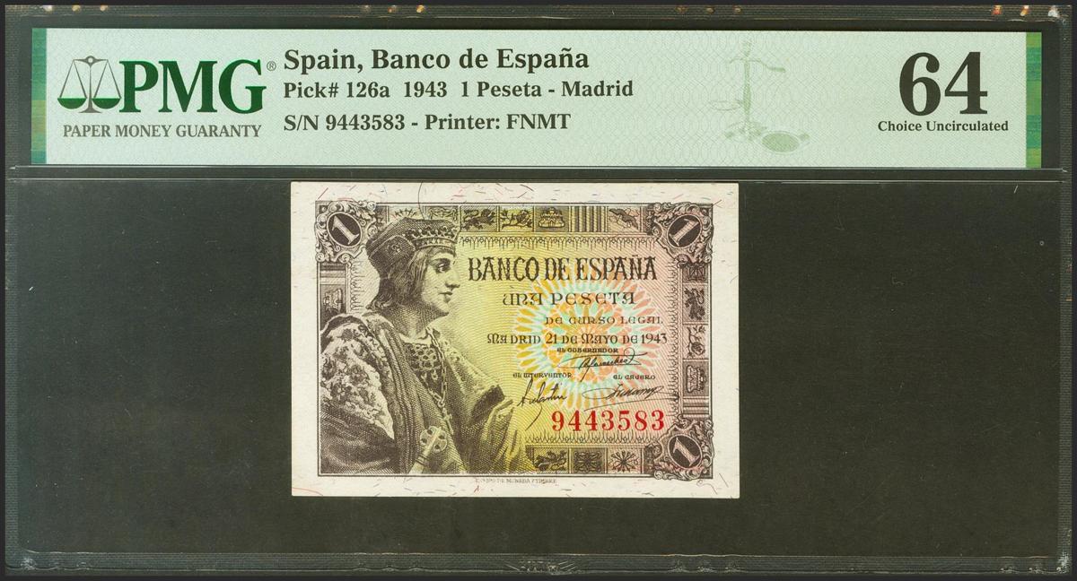 English 1 Peseta. May 21, 1943. No series. (Edifil 2021: 447, Pick: 126a). Uncirculated. PMG64 package.