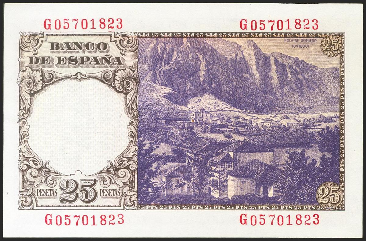 25 pesetas. February 19, 1946. Series G. (Edifil 2021: 450a). It retains all its original sizing. Uncirculated.
