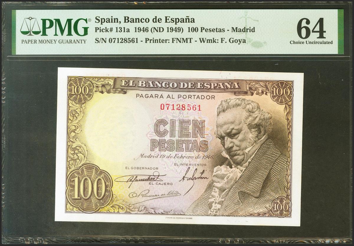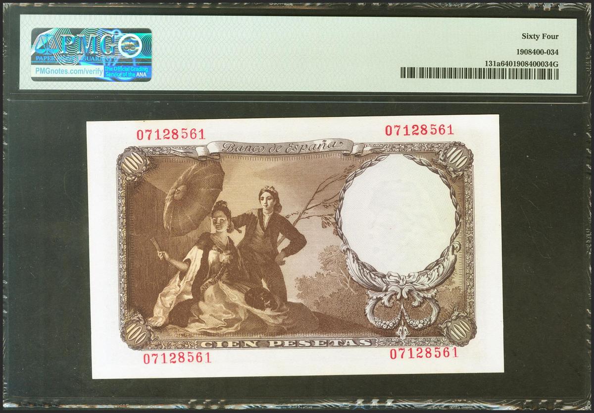 100 pesetas. February 19, 1946. No series. (Edifil 2021: 451, Pick: 131a). Uncirculated. PMG64 package.