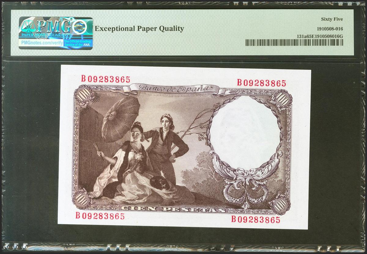 100 pesetas. February 19, 1946. Series B. (Edifil 2021: 451b). Unusual in this quality, retaining all its original sizing. Uncirculated. PMG65EPQ package.