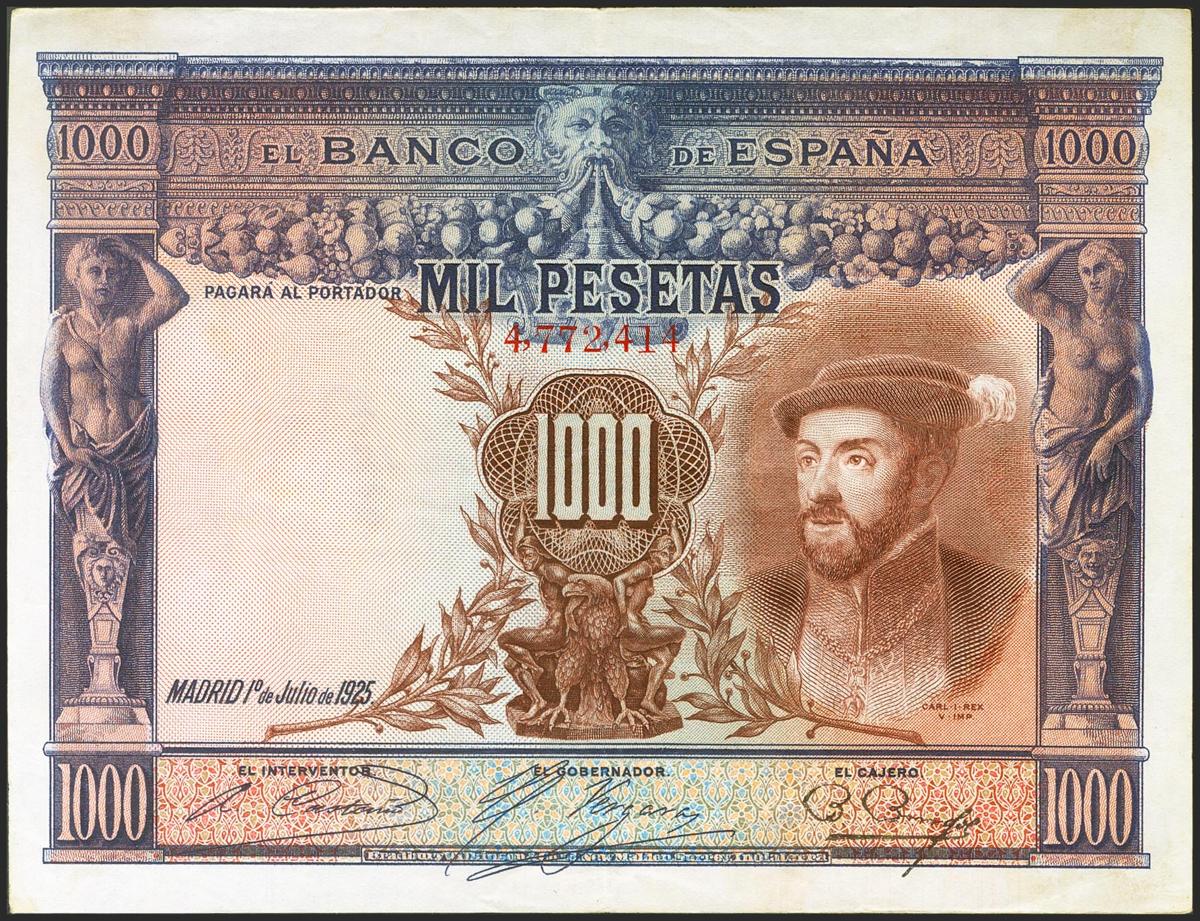 1000 Pesetas. July 1, 1925. No series and numbering after 3646000. (Edifil 2021: 351). Retains part of the original sizing. Extremely Fine.