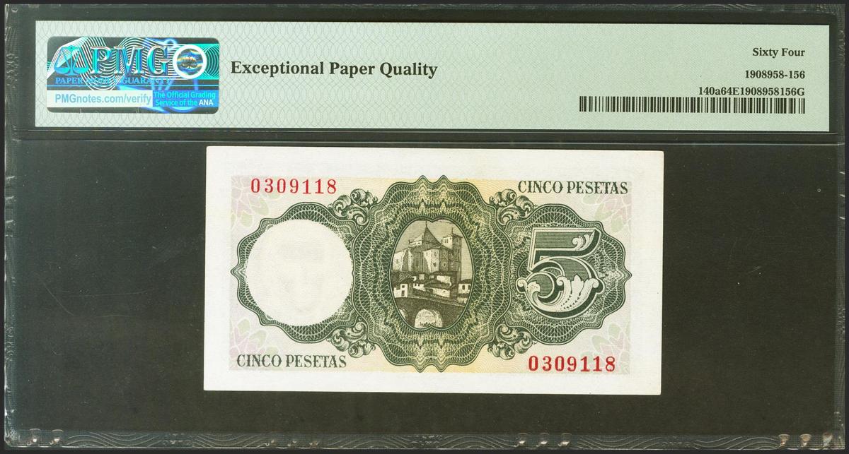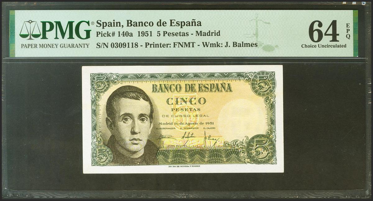 5 pesetas. August 16, 1951. No series. (Edifil 2021: 459, Pick: 140a). Original sizing. Uncirculated. PMG64EPQ package.