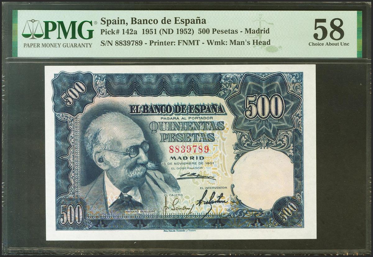 500 pesetas. November 15, 1951. No series. (Edifil 2021: 460, Pick: 142a). EBC++. PMG58 encapsulation.