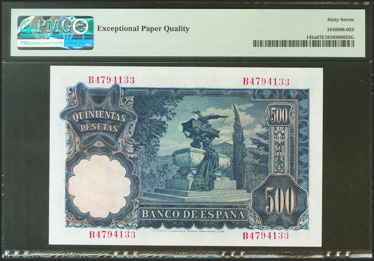 500 pesetas. November 15, 1951. Series B. (Edifil 2021: 460a). Extraordinarily rare in this exceptional quality, it retains all of its original sizing. Uncirculated. PMG67EPQ package.