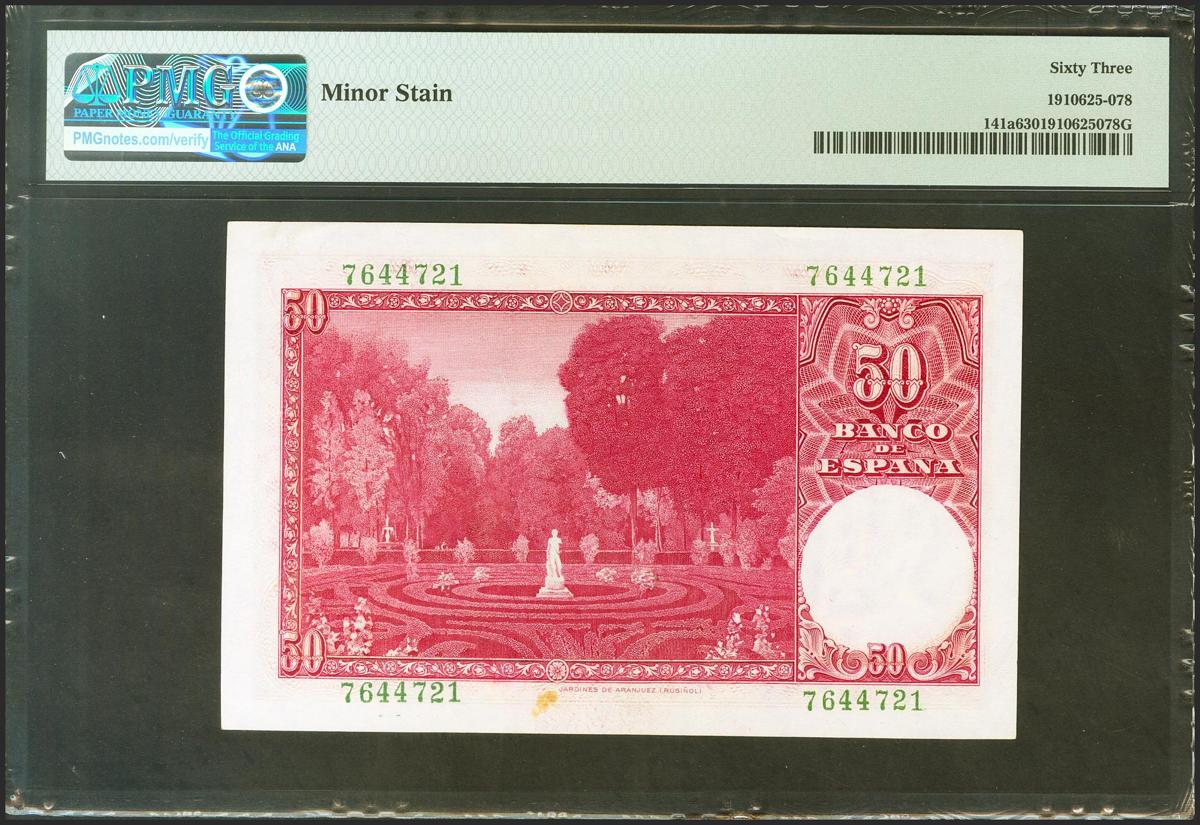 50 pesetas. December 31, 1951. No series. (Edifil 2021: 462, Pick: 141a). Uncirculated. PMG63 package.