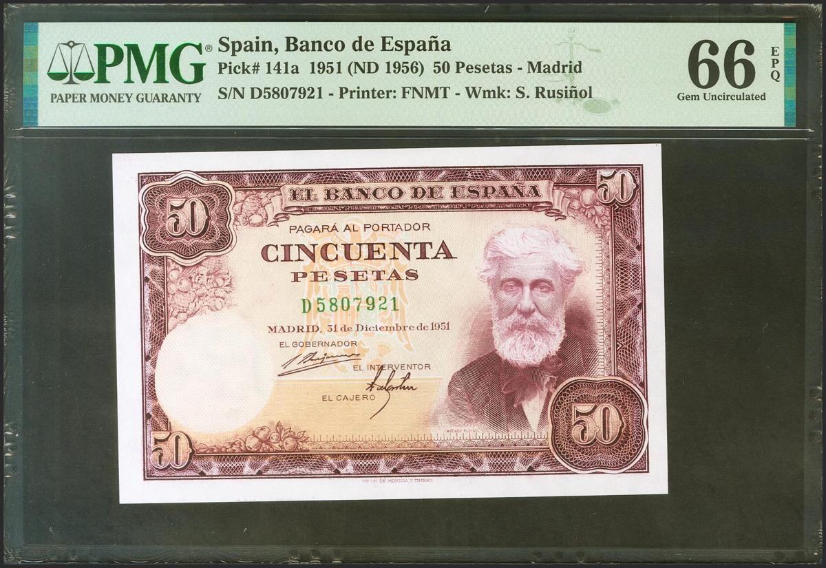 English 50 pesetas. December 31, 1951. Series D and cashier's signature missing. (Edifil 2021: 462c, Pick: 141a). Very rare and more in this exceptional quality, original sizing. Uncirculated. PMG66EPQ package