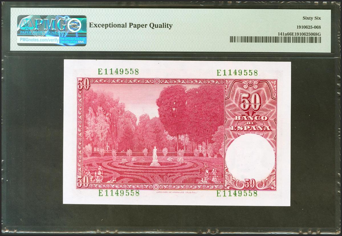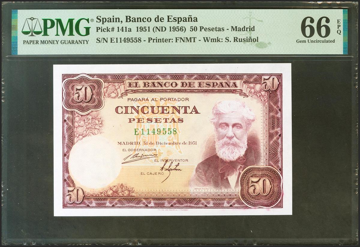 English 50 pesetas. December 31, 1951. Series E, last series issued and the cashier's signature is missing. (Edifil 2021: 462c, Pick: 141a). Very rare and more in this exceptional quality, original sizing. Uncirculated. PMG66EPQ package