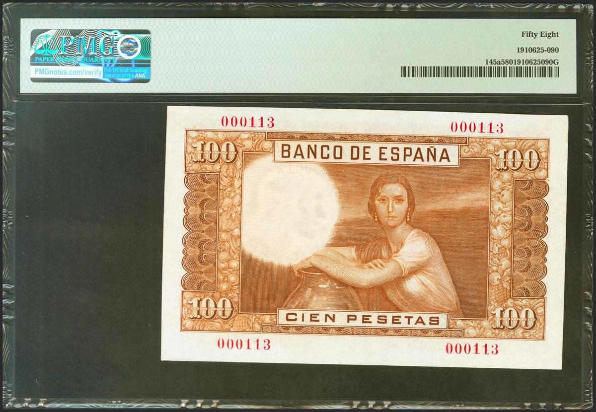 100 pesetas. April 7, 1953. No series and very low numbering. (Edifil 2021: 464, Pick: 145a). EBC++. PMG58 encapsulation.