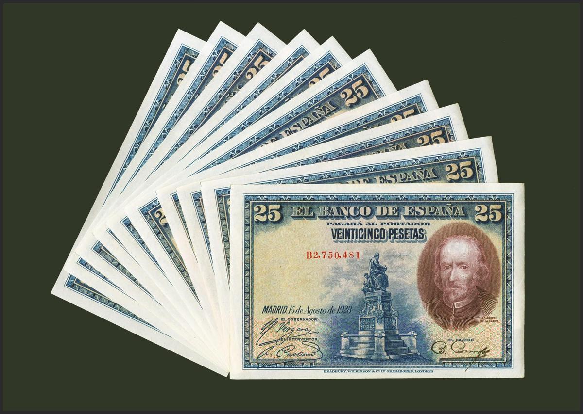 Beautiful set of 10 correlative 25 Pesetas bills issued on August 15, 1928 with series B (Edifil 2021: 353), keeping all its original sizing. Uncirculated/ Almost Uncirculated.
