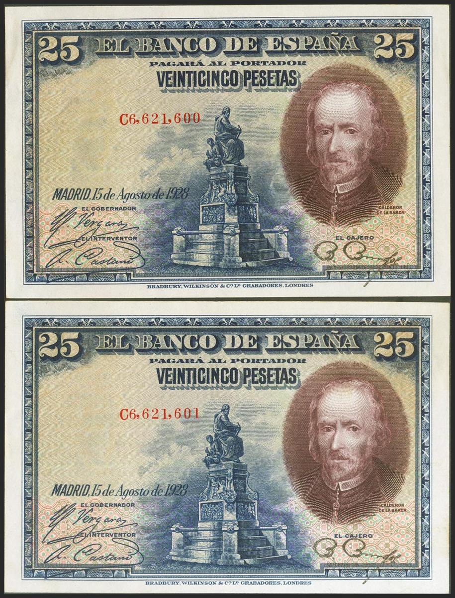 25 pesetas. August 15, 1928. Correlative couple. Series C. (Edifil 2021: 353). Original sizing. Almost Uncirculated.