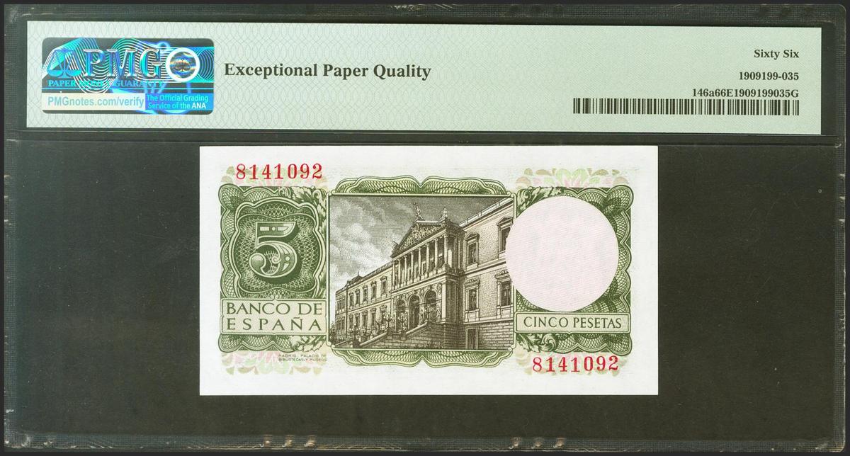 5 pesetas. July 22, 1954. No series. (Edifil 2021: 466, Pick: 146a). Rare in this quality, original sizing. Uncirculated. PMG66EPQ package.
