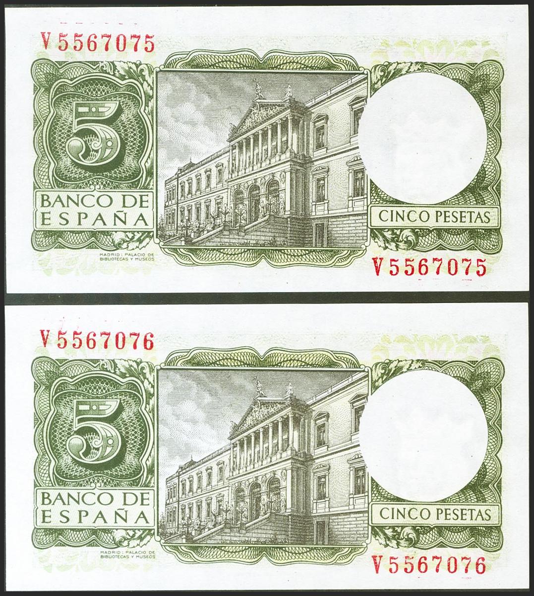 English 5 pesetas. July 22, 1954. Correlative couple. Series V. (Edifil 2021: 466a). It retains all its original sizing. Uncirculated.