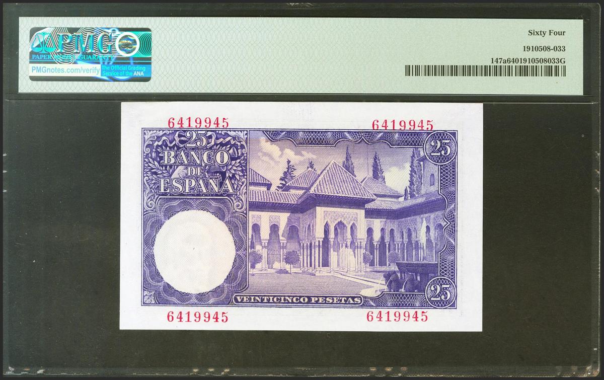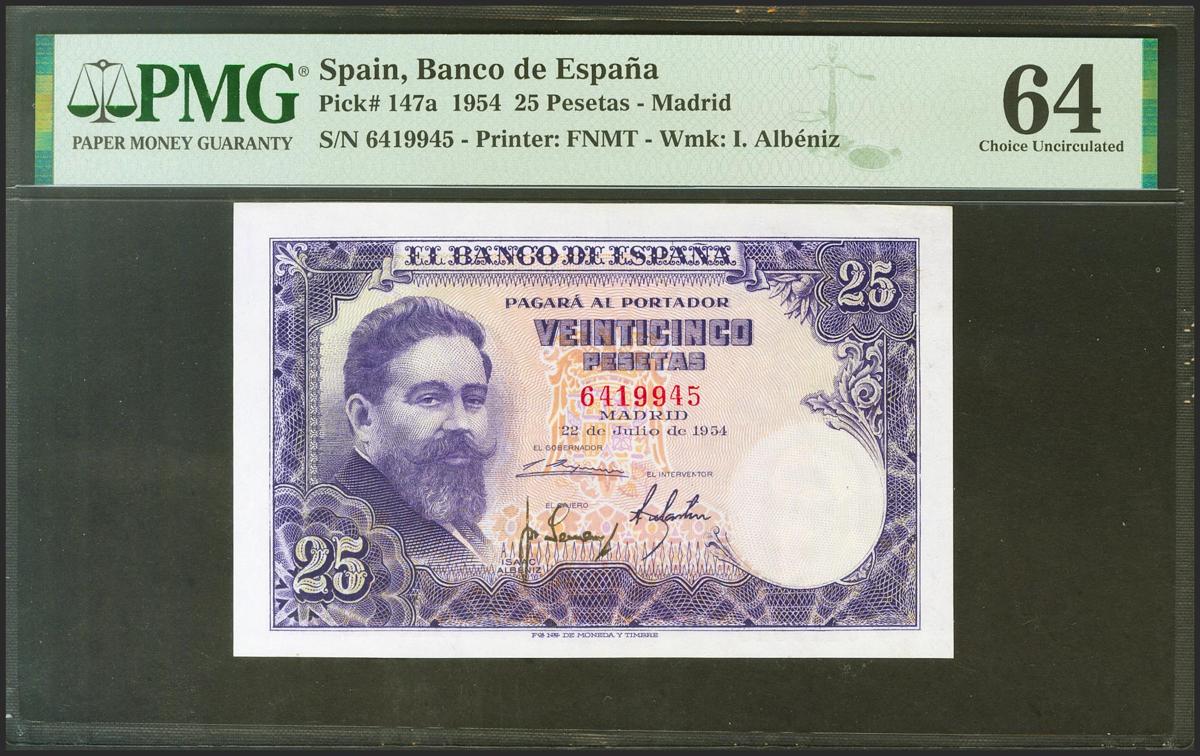 25 pesetas. July 22, 1954. No series. (Edifil 2021: 467). Unusual. Uncirculated. PMG64 package.