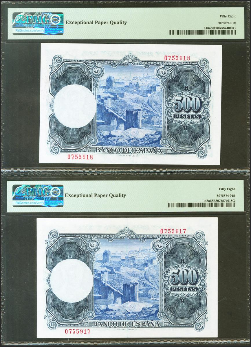 500 pesetas. July 22, 1954. Correlative couple. No serie. (Edifil 2021: 468, Pick: 148a). Original sizing. EBC+++. PMG58EPQ packages, both.