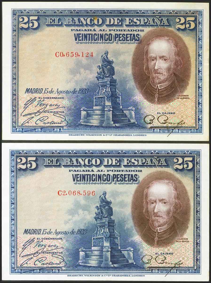 Set of 2 25 Pesetas banknotes issued on August 15, 1928 with series C (Edifil 2021: 353), retaining much of the original sizing. Almost Uncirculated-/ Uncirculated.