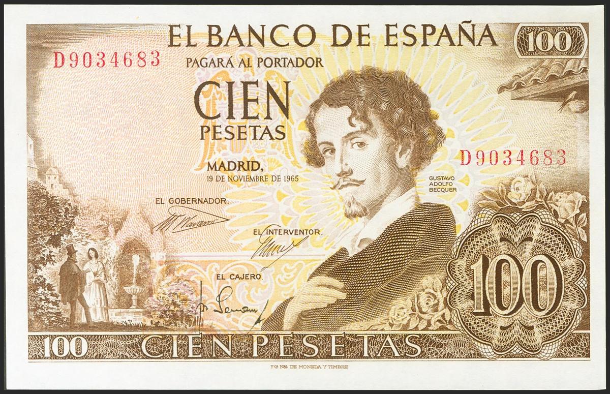 English 100 pesetas. November 19, 1965. Series D. (Edifil 2021: 470a). Retains most of the original sizing. Good Extremely Fine.