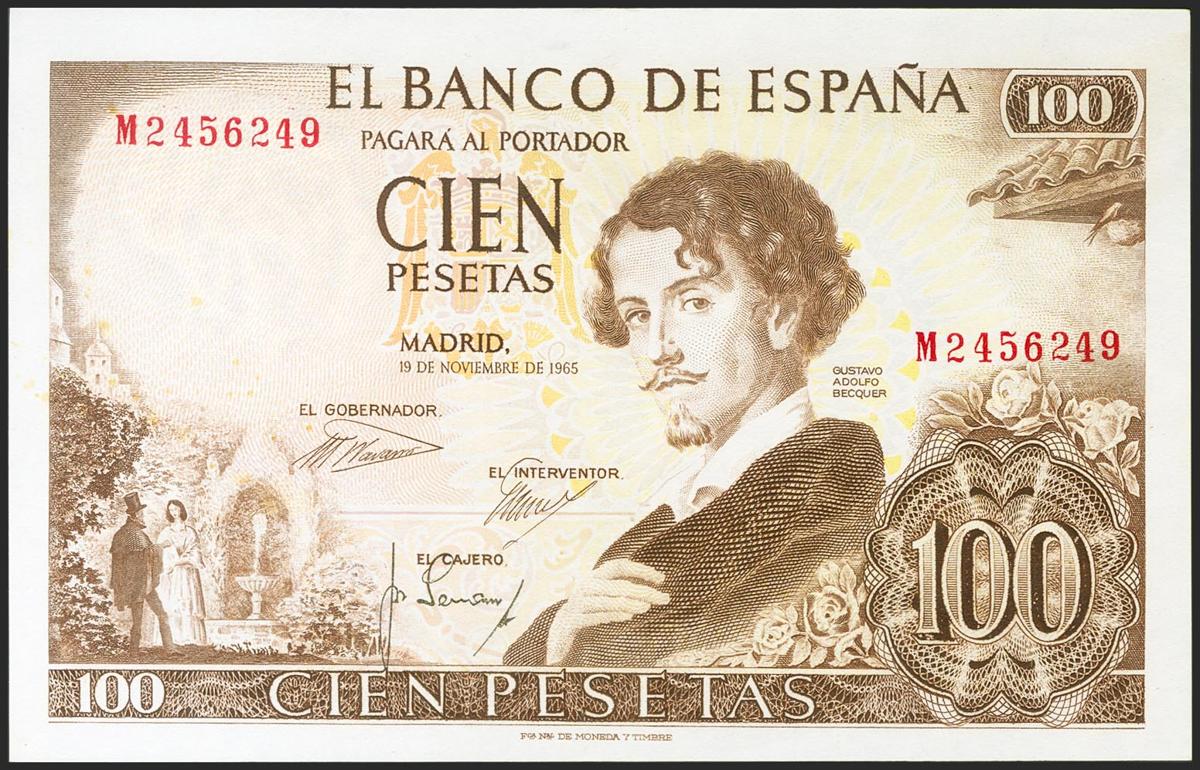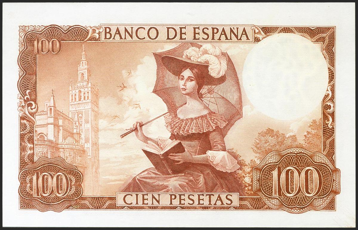 100 pesetas. November 19, 1965. Series M. (Edifil 2021: 470a). Original sizing. Almost Uncirculated.
