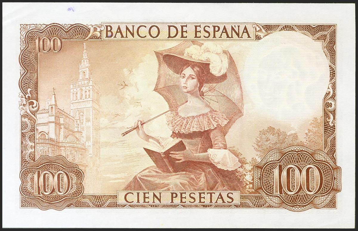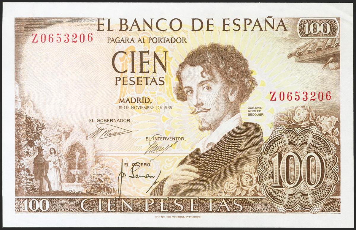 100 pesetas. November 19, 1965. Series Z. (Edifil 2021: 470a). Original sizing, ink stain on the back. EBC++.