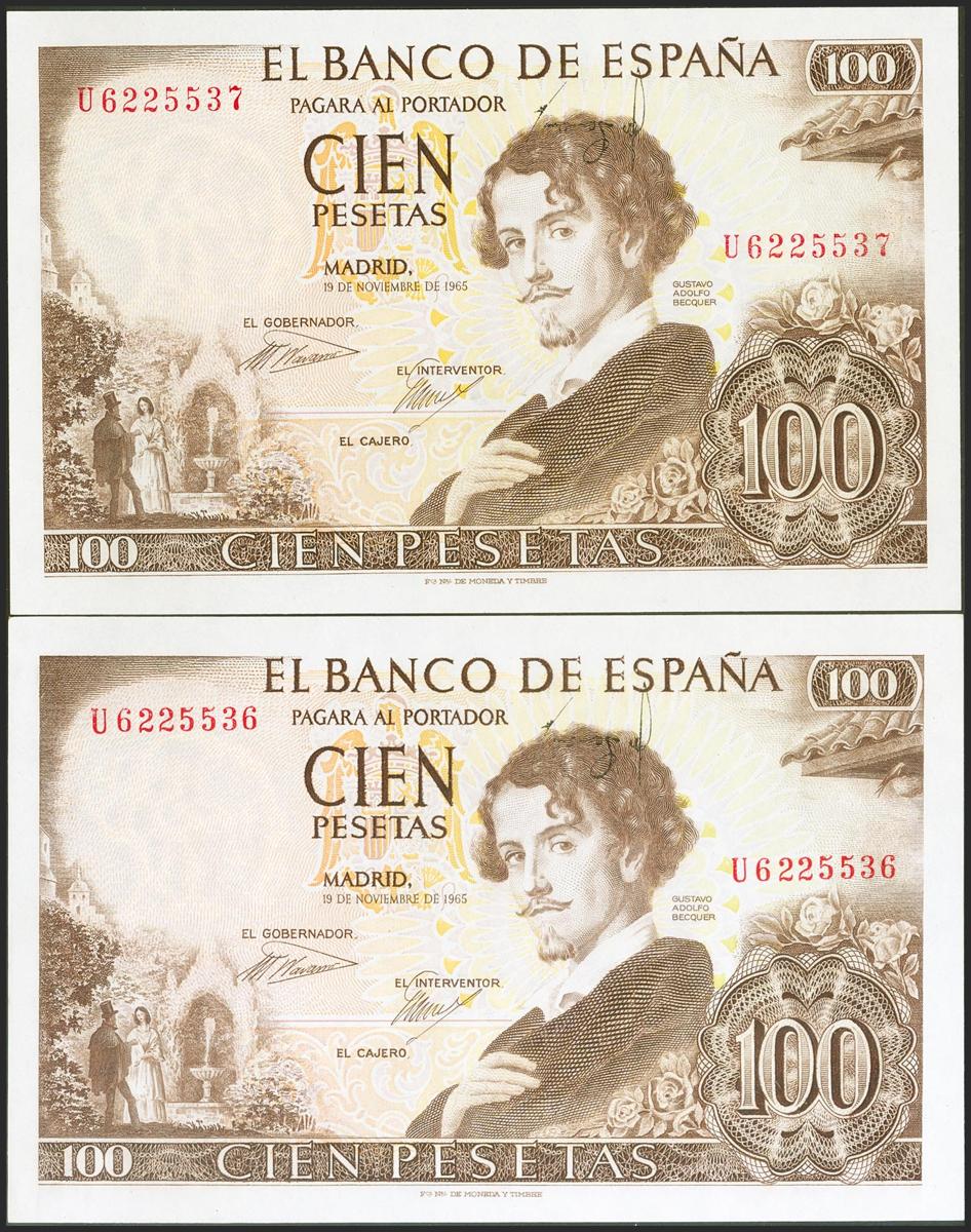 English 100 pesetas. November 19, 1965. Correlative couple. Error in the inverted and displaced cashier's signature. Series U. (Edifil 2021: 470a). It retains all its original sizing. Uncirculated.