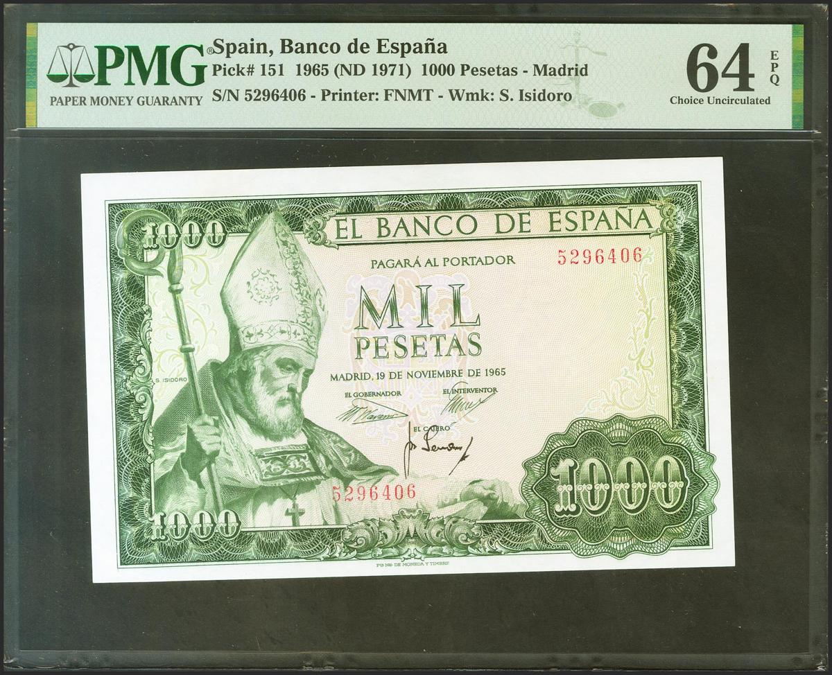 English 1000 Pesetas. November 19, 1965. No series. (Edifil 2021: 471, Pick: 151). Unusual in this quality, original sizing. Uncirculated. PMG64EPQ package.