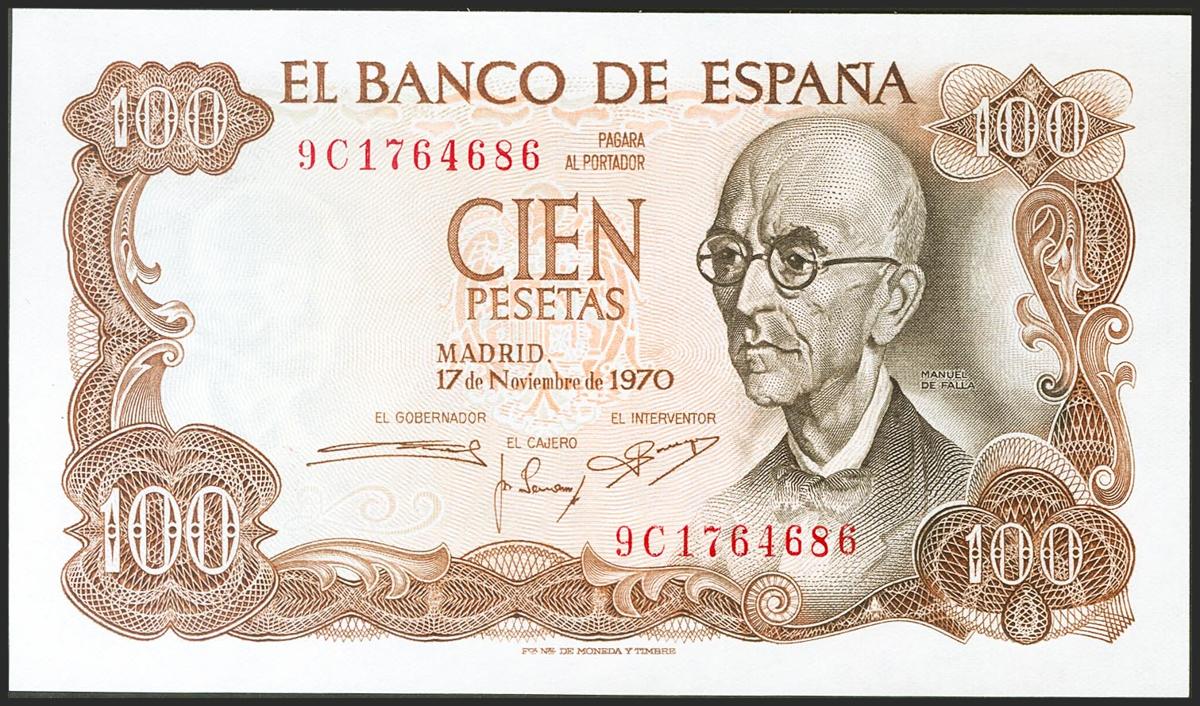 100 pesetas. November 17, 1970. Special series 9C. (Edifil 2021: 472d). Original sizing. Uncirculated.