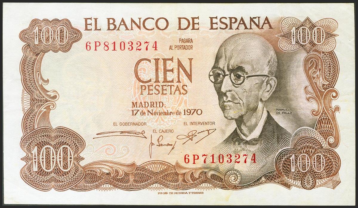 100 pesetas. November 17, 1970. Numbering error. 6P series. (Edifil 2021: 472c). Unusual. Almost Extremely Fine.