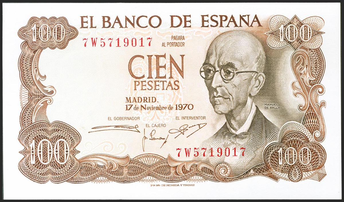 100 pesetas. November 17, 1970. Series 7W, last series issued. (Edifil 2021: 472c). It retains all its original sizing. Almost Uncirculated.