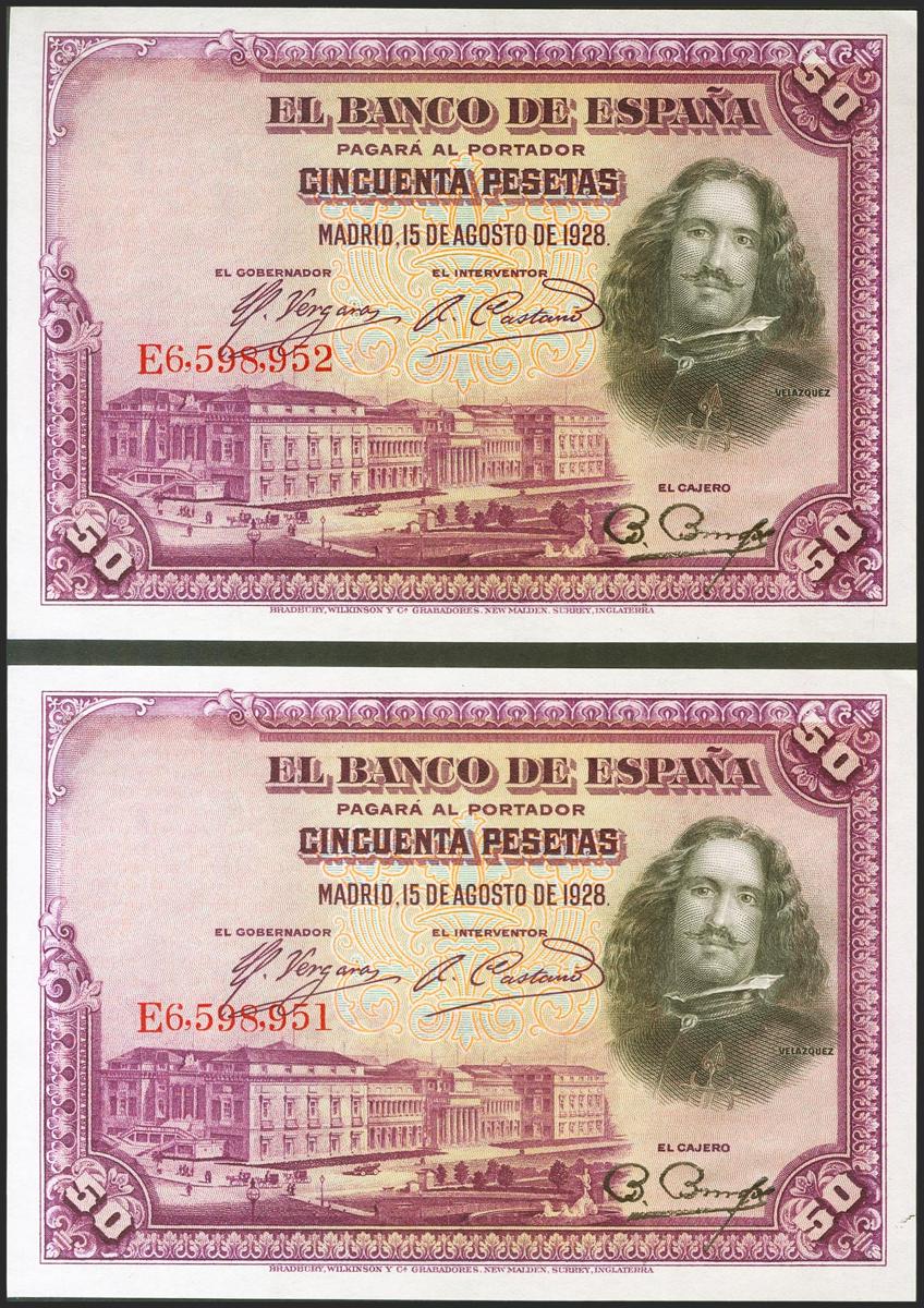 50 pesetas. August 15, 1928. Correlative couple. Series E, last series issued. (Edifil 2021: 354). It retains all its original sizing. Uncirculated.