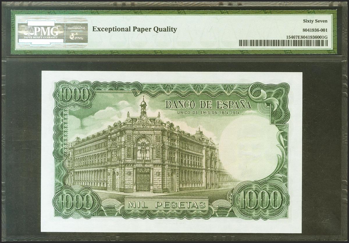 1000 Pesetas. September 17, 1971. Series 4A. (Edifil 2021: 474c, Pick: 154). Rare in this spectacular quality, original sizing. Uncirculated. PMG67EPQ package.
