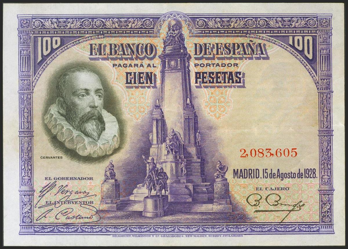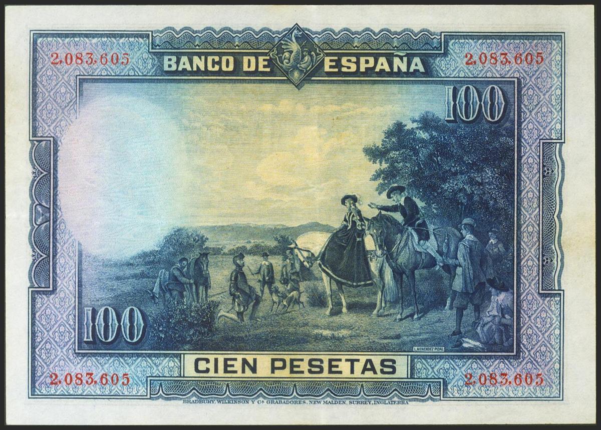 English 100 pesetas. August 15, 1928. No series. (Edifil 2021: 355). Unusual in this quality, original sizing. Good Extremely Fine.