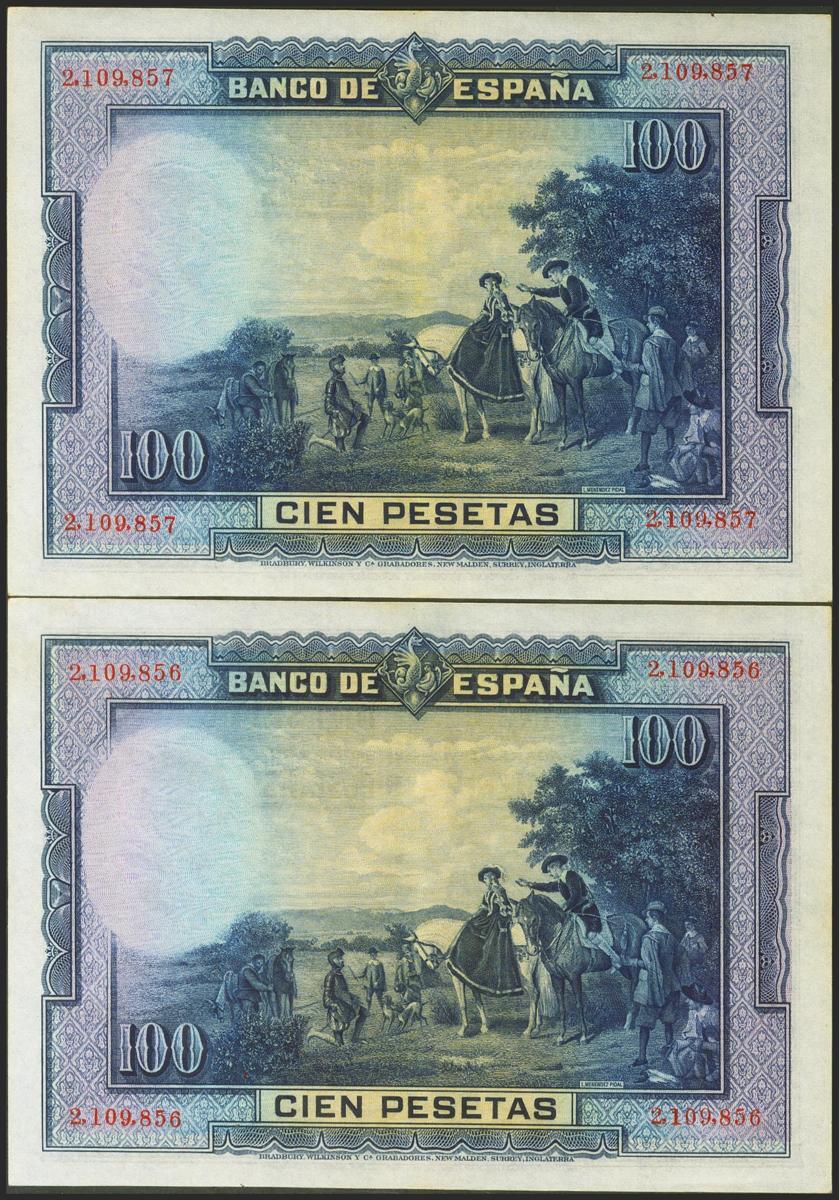 100 pesetas. August 15, 1928. Correlative couple. No serie. (Edifil 2021: 355). Unusual in this quality, original sizing. Good Extremely Fine.