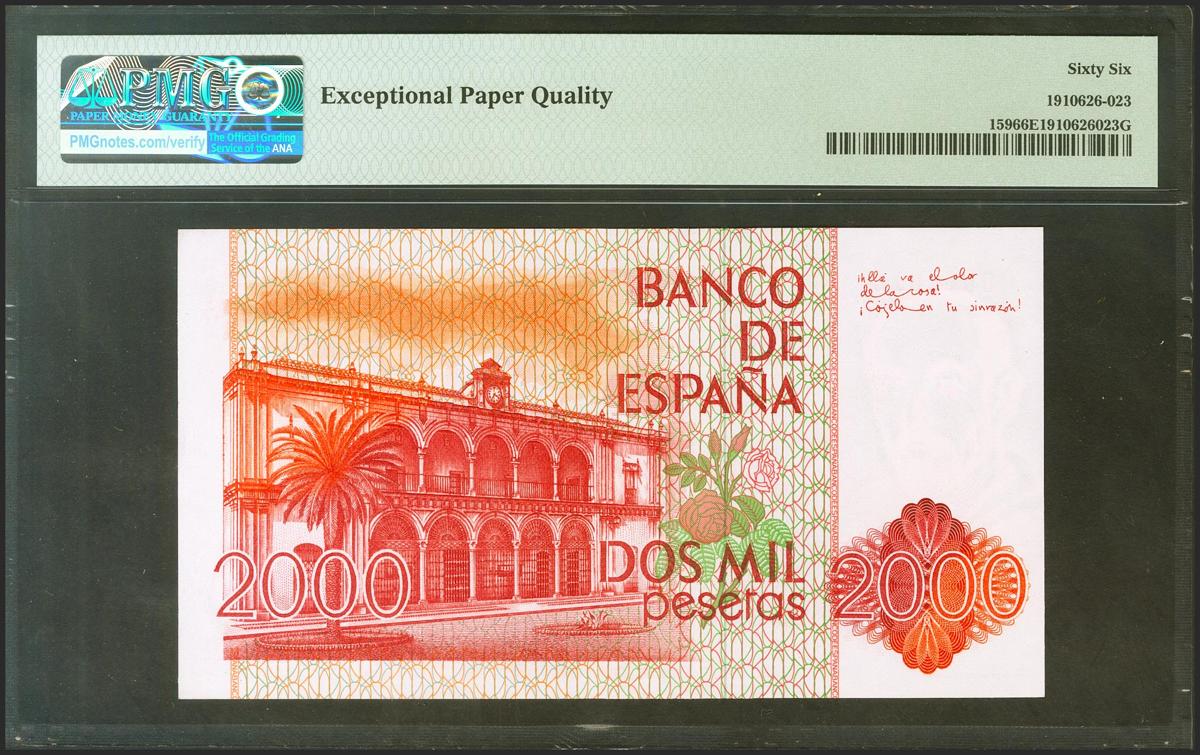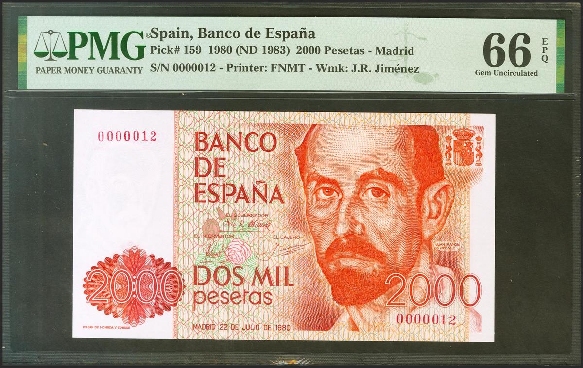 2000 Pesetas. July 22, 1980. No series and very low numbering. (Edifil 2021: 479, Pick: 159). Very rare, especially in this exceptional quality, original sizing. Uncirculated. PMG66EPQ package.