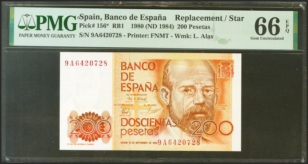 200 Pesetas. September 16, 1980. Special series 9A. (Edifil 2021: 480b, Pick: 156*). Rare in this exceptional quality. Uncirculated. PMG66EPQ package.