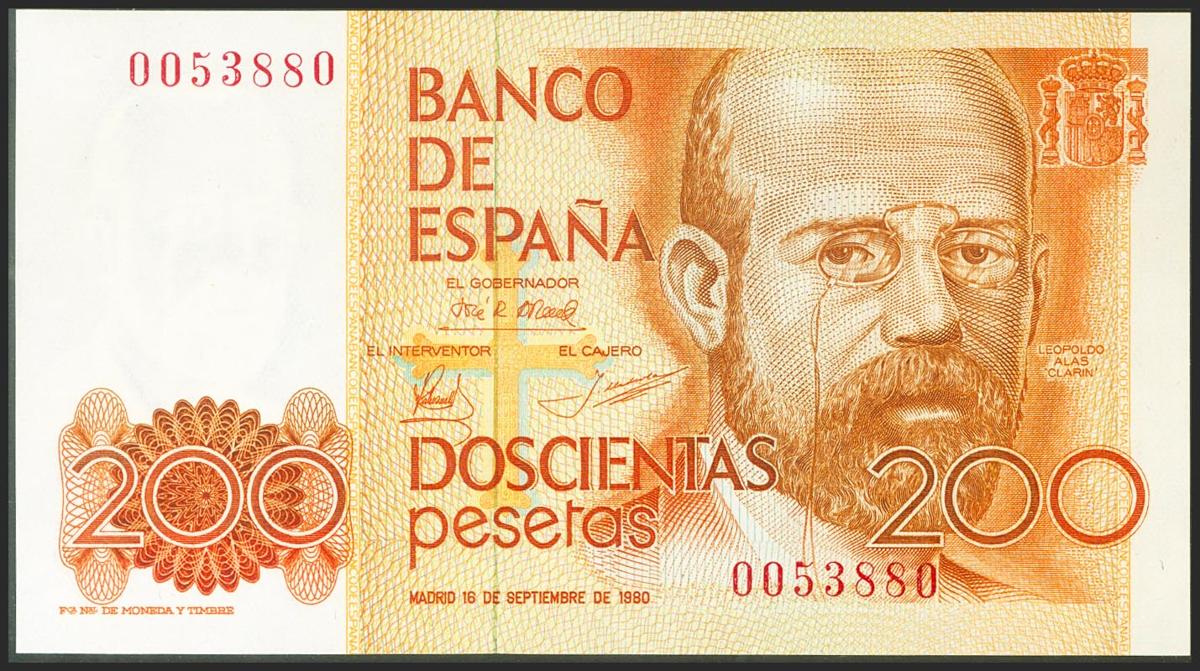 200 Pesetas. September 16, 1980. No series and very low numbering. (Edifil 2021: 480). Uncirculated.
