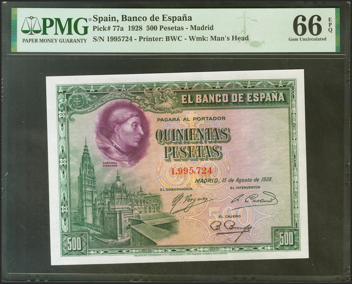 English 500 pesetas. August 15, 1928. No series. (Edifil 2021: 356, Pick: 77a). Rare in this exceptional quality, original sizing. Uncirculated. PMG65EPQ package.