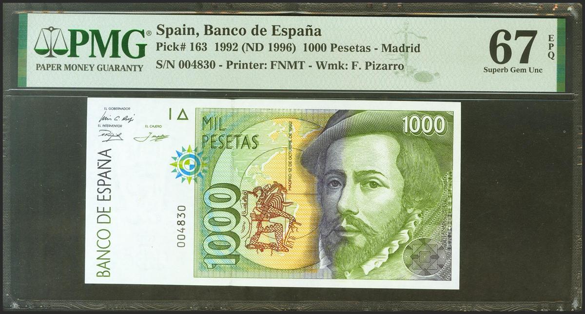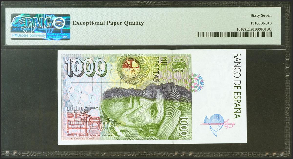 1000 Pesetas. October 12, 1992. No series and very low numbering. (Edifil 2021: 483, Pick: 163). Rare in this exceptional quality. Uncirculated. PMG67EPQ package.