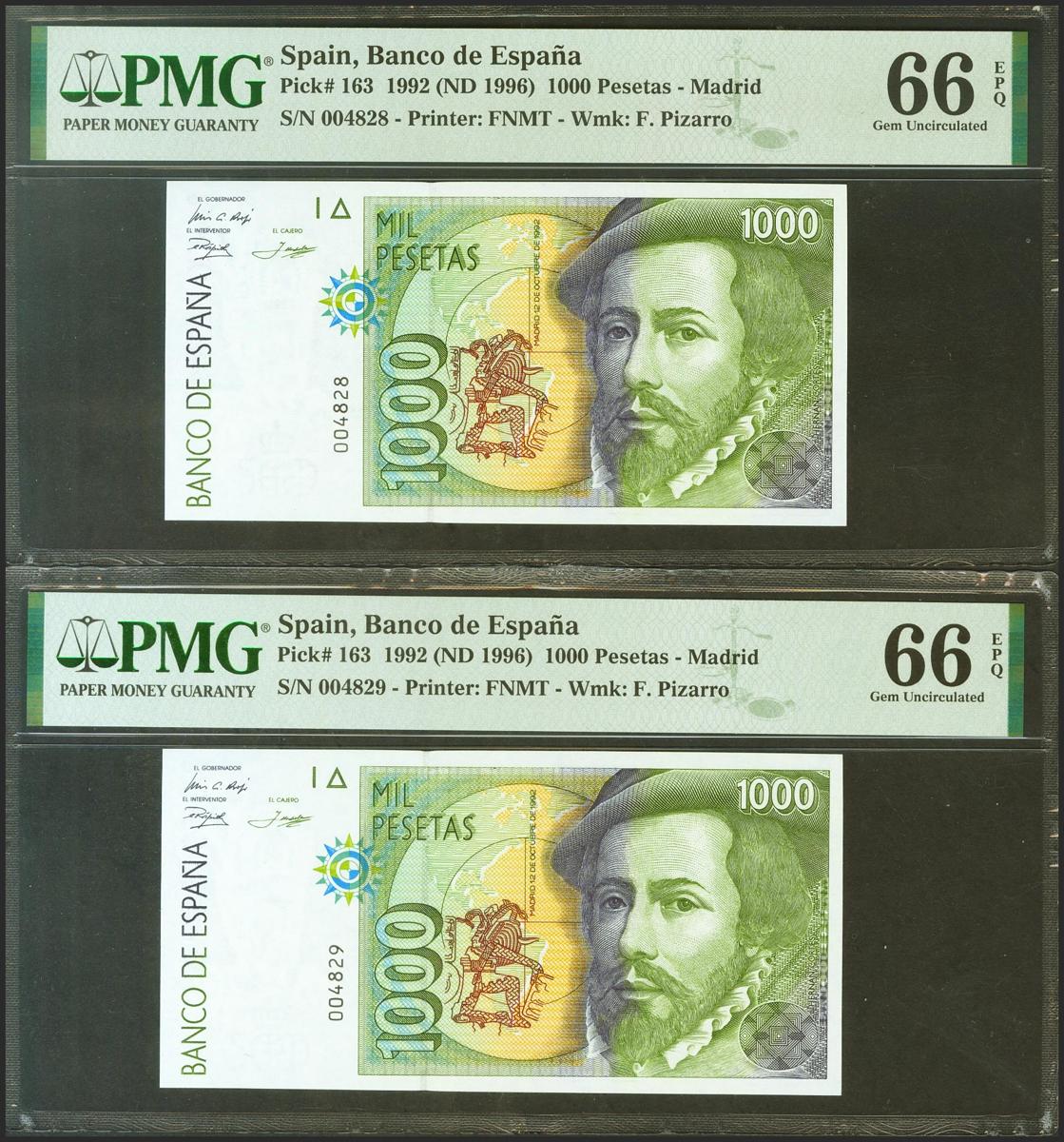 1000 Pesetas. October 12, 1992. Correlative couple. No series and very low numbering. (Edifil 2021: 483, Pick: 163). Rare in this exceptional quality. Uncirculated. PMG66EPQ packages, both.