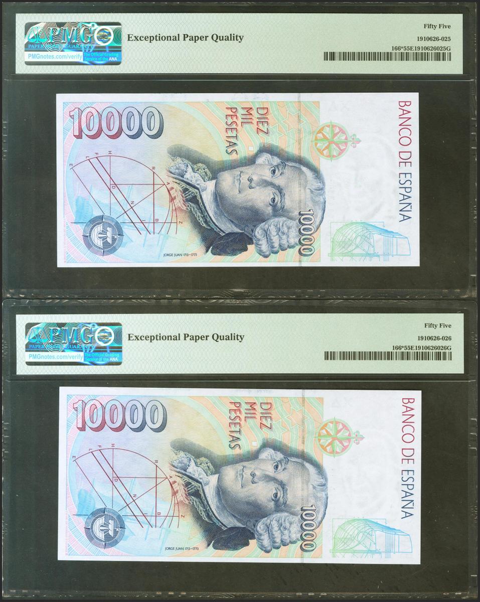 10,000 Pesetas. October 12, 1992. Correlative couple. Special series 9A. (Edifil 2021: 485b, Pick: 166*). Original sizing. Good Extremely Fine. PMG55EPQ package, both.