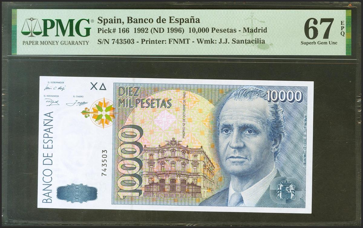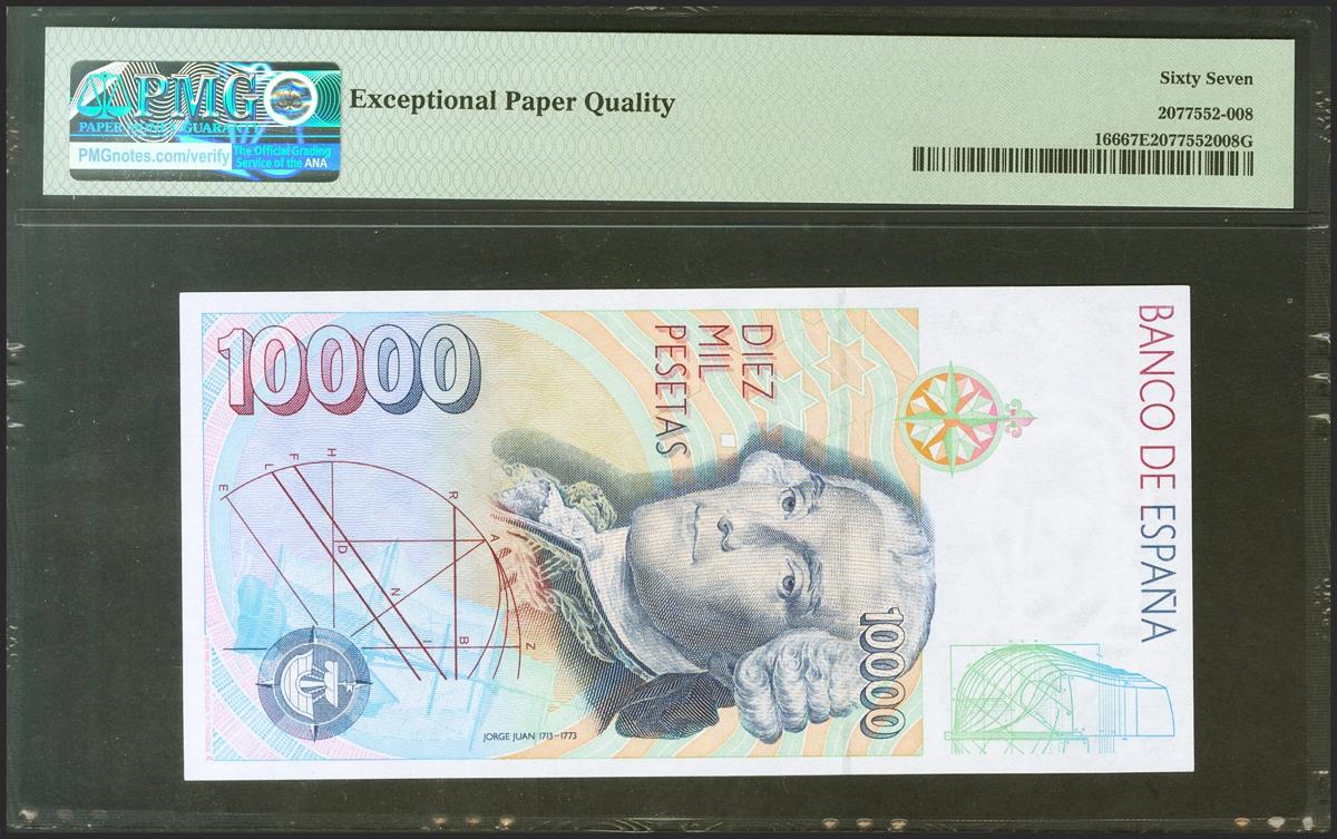 10,000 Pesetas. October 12, 1992. No series. (Edifil 2021: 485, Pick: 166). Extraordinarily rare in this exceptional quality, it retains its original sizing. Uncirculated. PMG67EPQ package.
