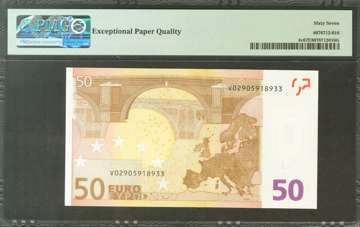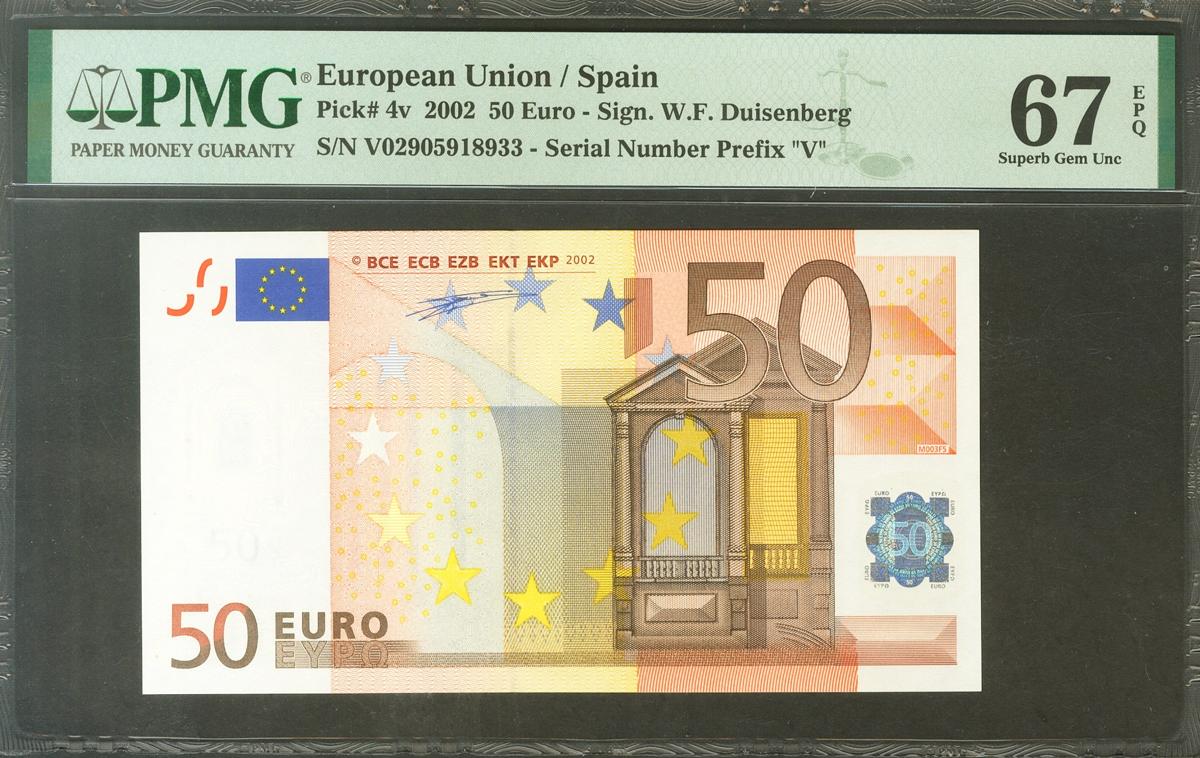 50 euros. January 1, 2002. Signature Duisenberg. Series V (Spain). (Edifil 2021: 489, Pick: 4v). Uncirculated. PMG67EPQ package.