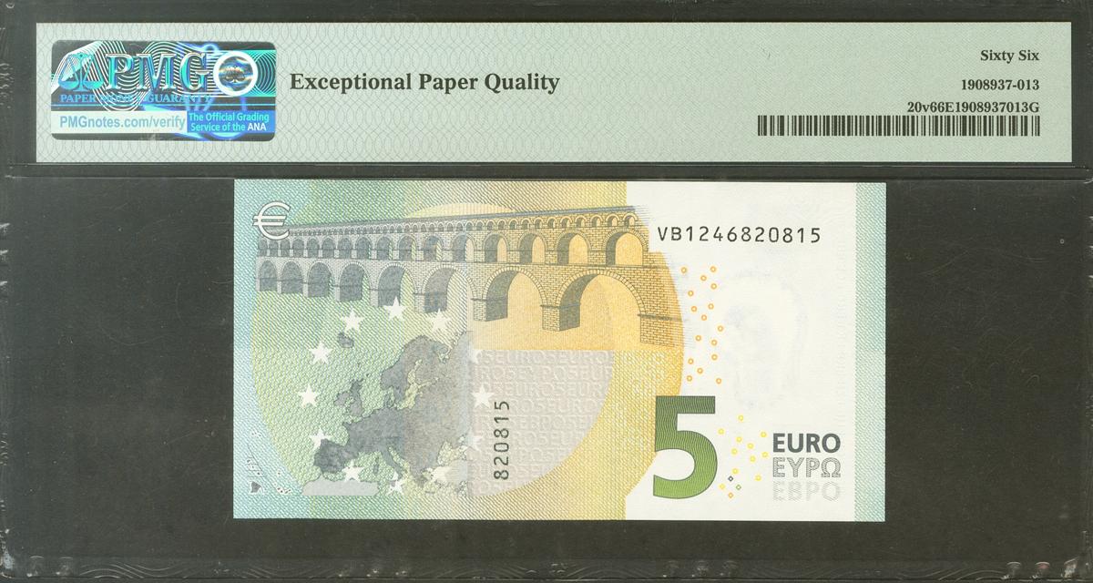 English 5 euros. May 2, 2013. Signature Draghi. Series V (Spain). (Edifil 2021: 493, Pick: 20v). Uncirculated. PMG66EPQ package.