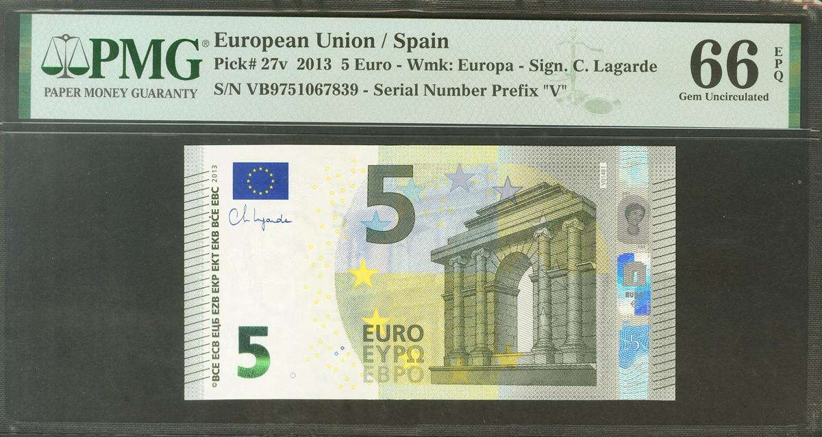 5 euros. May 2, 2013. Signature Lagarde. Series V (Spain). (Edifil 2021: 493A, Pick: 27v). Uncirculated. PMG66EPQ package.