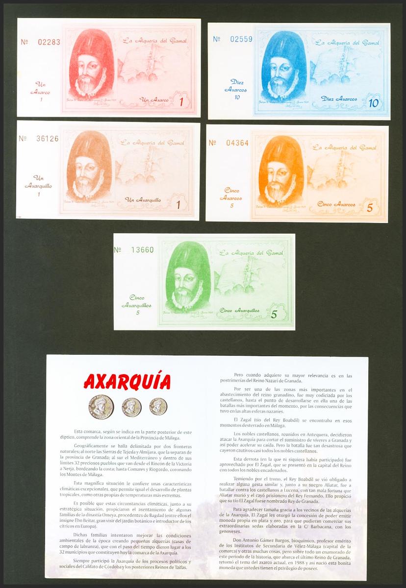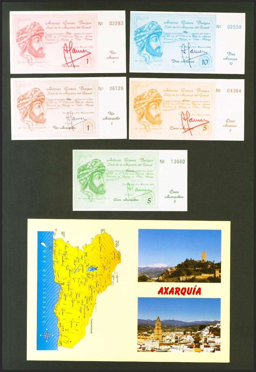 Series of 5 banknotes of 1 and 5 Axarcos and 1, 5 and 10 Axarcos. March 21, 1988. Velez, Malaga. Antonio Gámez Burgos, Said of the Gamal Archery. Your presentation folder is included. Uncirculated.