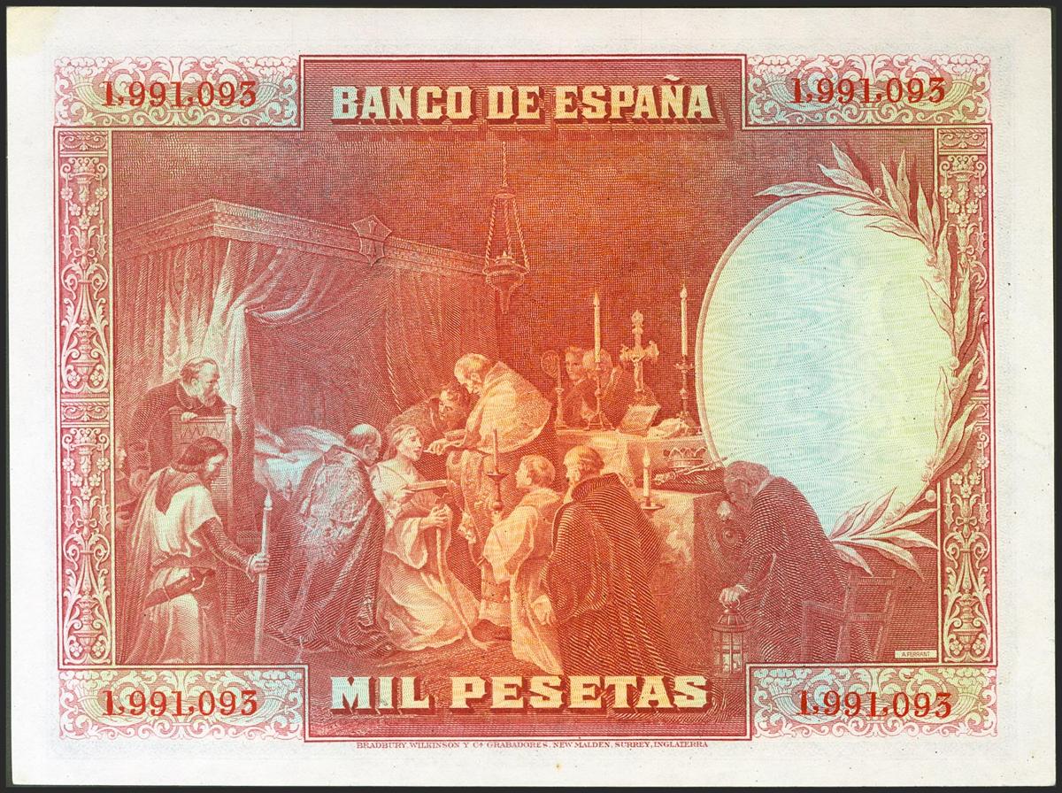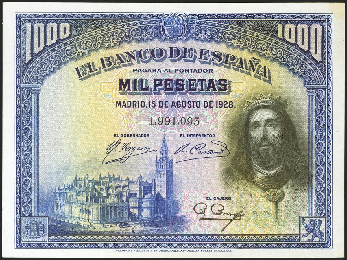 1000 Pesetas. August 15, 1928. No series. (Edifil 2021: 357). It retains all its original sizing. Almost Uncirculated.