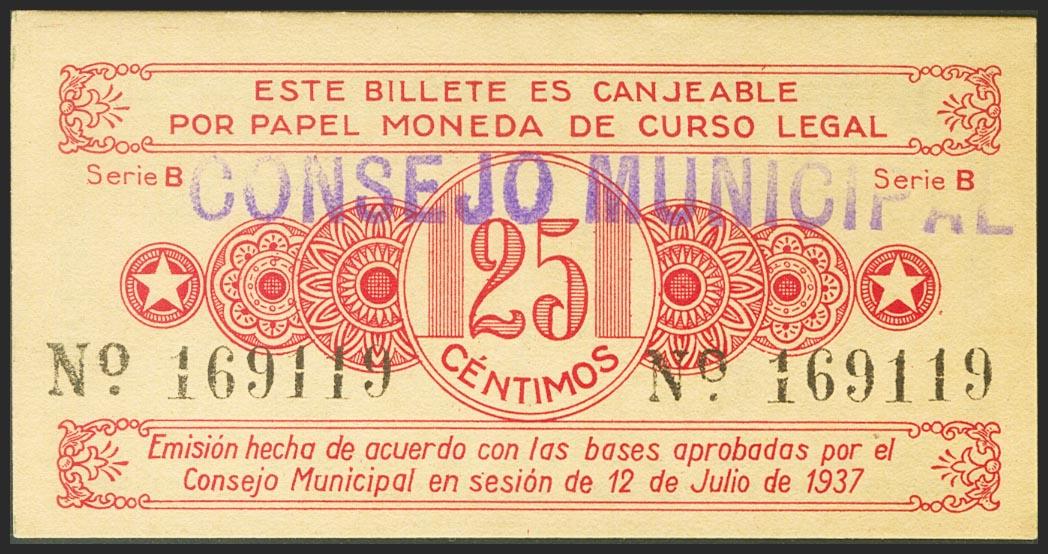 English ALCOY (ALICANTE). 25 cents. July 12, 1937. Mark "Municipal Council". (Gonzalez: 378a). Extremely Fine.