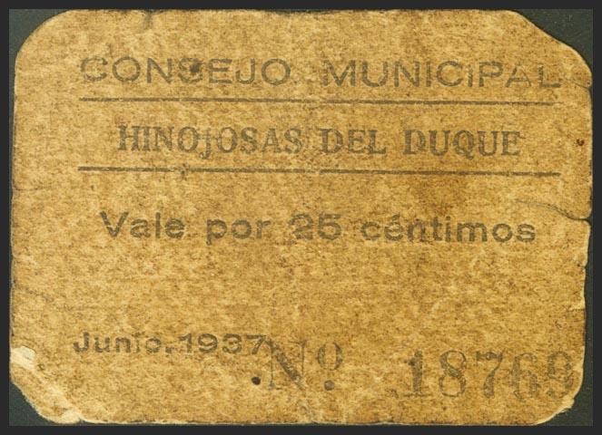 HINOJOSA OF THE DUKE (BADAJOZ). 25 cents. June 1937. (González: 2862). Rare. Good Fine.
