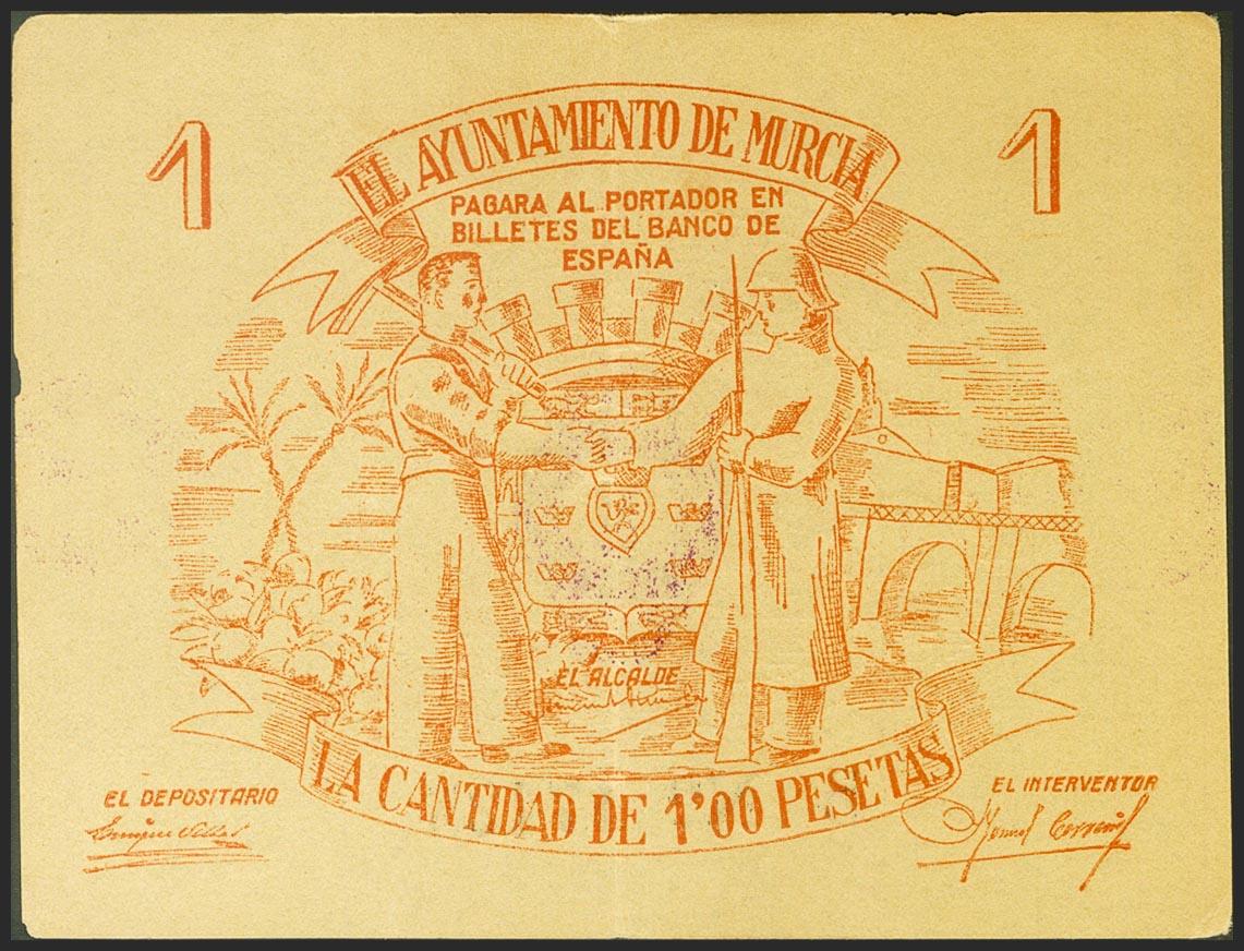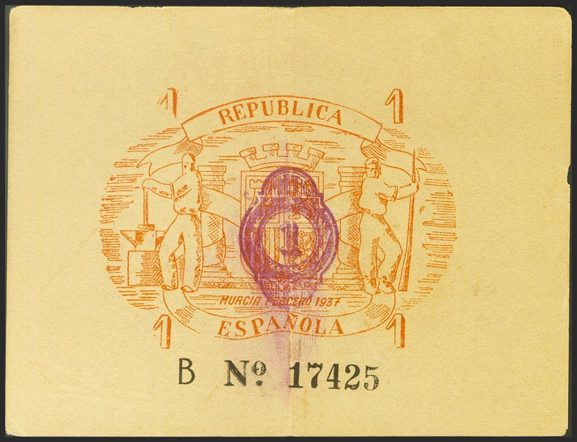 MURCIA. 1 Peseta. (1937ca). Series B. (González: 3769). Unusual. Very Fine.