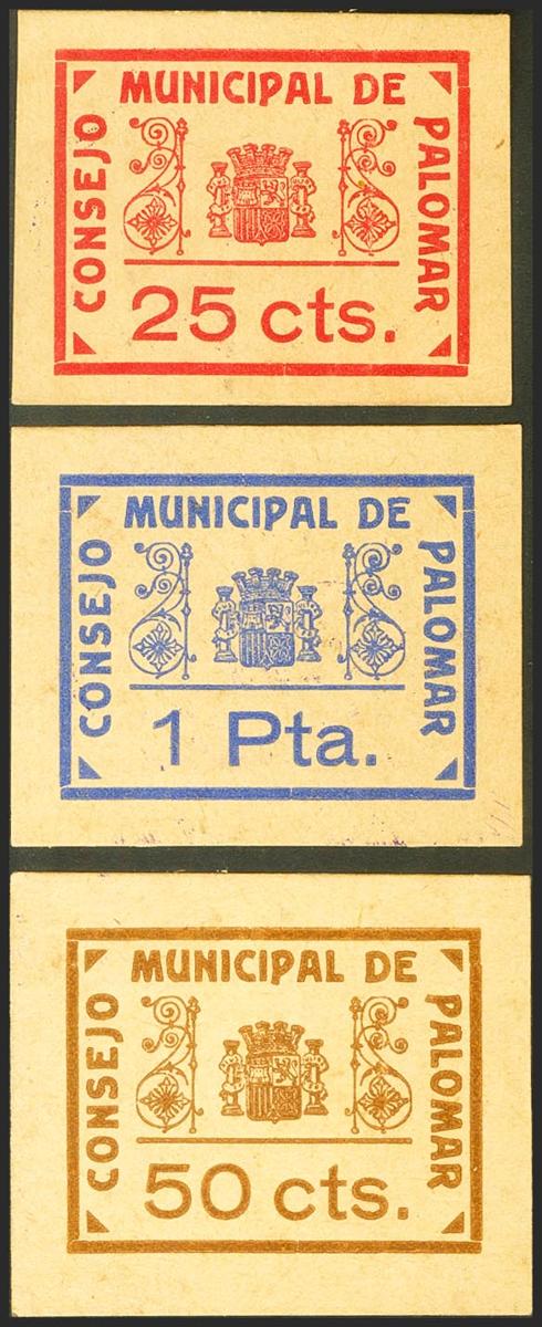 English PALOMAR (VALENCIA). 25 Cents, 50 Cents and 1 Peseta. (1937ca). (González: 4039/41). Very rare complete series, to get an idea of the rarity the 1 pts is not photographed in the catalogue. Almost Uncirculated.