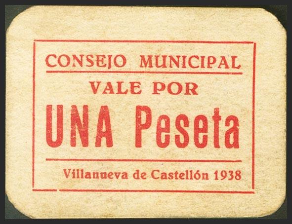 VILLANUEVA DE CASTELLON (VALENCIA). 1 Peseta. 1938. Series A. (González: 5619). Rare. Extremely Fine.